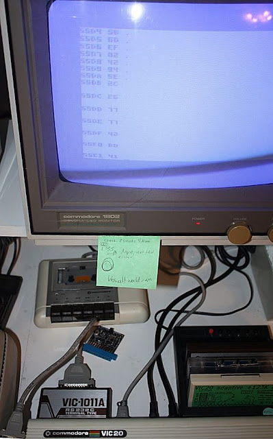 Once I got it working, I hooked the KIM-1 up to my VIC-20 through the VIC-1011A TTL interface and used the VIC's keyboard and monitor to program the computer. The protocol settings are: 2400bps, 8 data bits, no parity, two stop bits, no flow control.
