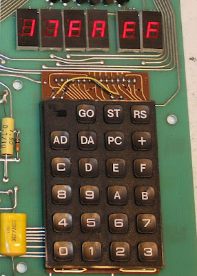 The keyboard has the sixteen hex digits for entering addresses or data. The AD button selects "Address" mode, where any entry on the keyboard will change the current working address. The DA button selects "Data" mode, where any entry will change the contents of the address shown on the LED screen. When in either Data or Address mode, the + key will advance to the next address byte.