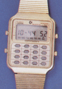 Mens LCD calculator,+alarm,+date,8dig,grey pad,gold trim&ban