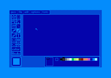 geoPaint features a virtual page where an editable portion is always available. The toolbox on the left hand side includes cut-and-paste tool, region fill and paintbrush tool (with definable patterns for both), drawing and erasing tools, outline and filled square and circle drawing tools, text writer with access to all of GEOS fonts and styles, and a full coloring palette.