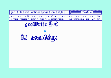 geoWrite 2.1 is the full-featured word processor built to produce the sharpest documents. It includes full GEOS font and style support, cut and paste ability for text AND pictures, point and click tab and margin setting, four kinds of text justifications, string search, headers, footers, and page numbering.