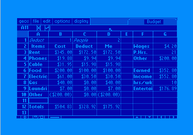 Anyone who has used a text based spreadsheet knows what a chore it is to navigate the cells, make the cells fit your text or values, or remember all the control keys necessary to utilize its features. geoCalc has none of these problems. Cells rows and columns are easily resizable, the features are all available off of pull-down menus, and navigation is as easy as point-and-click.