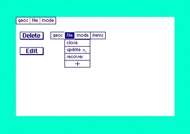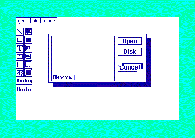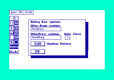 The real workhorse in geoBeaver is the Dialog Box Editor. A full 12 tools and 2 buttons are available: the Line tool, the Outline Box Tool (with patterning), the Filled Box tool (with fill patterns), the Bitmap tool, the Text tool (with styling), the User Clickbox tool (with return code defaults), a System Button tool, a User Input tool (with Buffer name and length settings), a Variable Text tool, a File Box tool (with application type and class settings), a selection Tool (for resizing and moving all the above around), an UNDO Button, and a Dialog Box button for setting auto-close modes, otherPressVecs, and extra-draw routines. The dialog box exports as a callable function which will setup all your registers for the settings you've made.